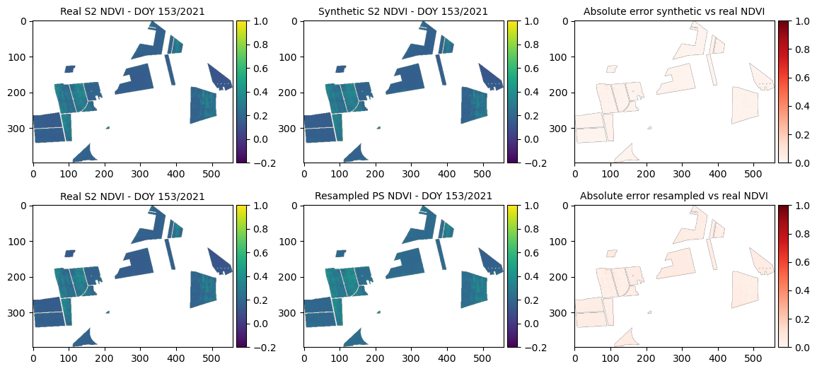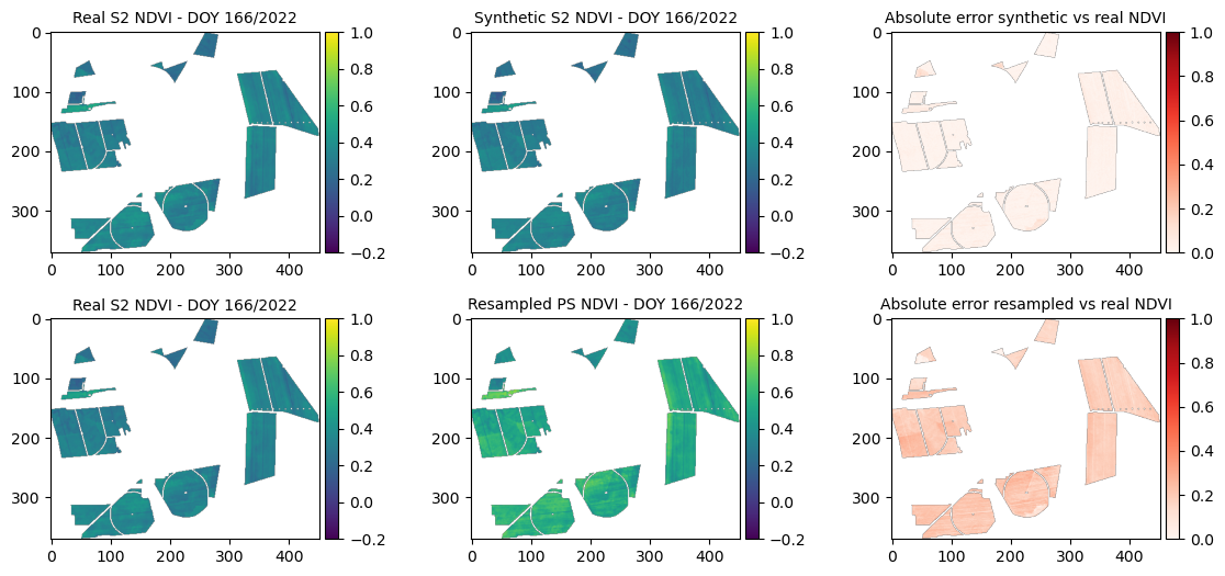 In this tutorial we show how to train the RF model and generate synthetic Sentinel-2 (S2) images, based on Planet-Scope (PS) data from 2021 and 2022. The validation is exemplified in the maps comparing original S2, synthetic S2 and resampled PS images, as well as absolute error synthetic vs original S2 and SSIM index are compared.