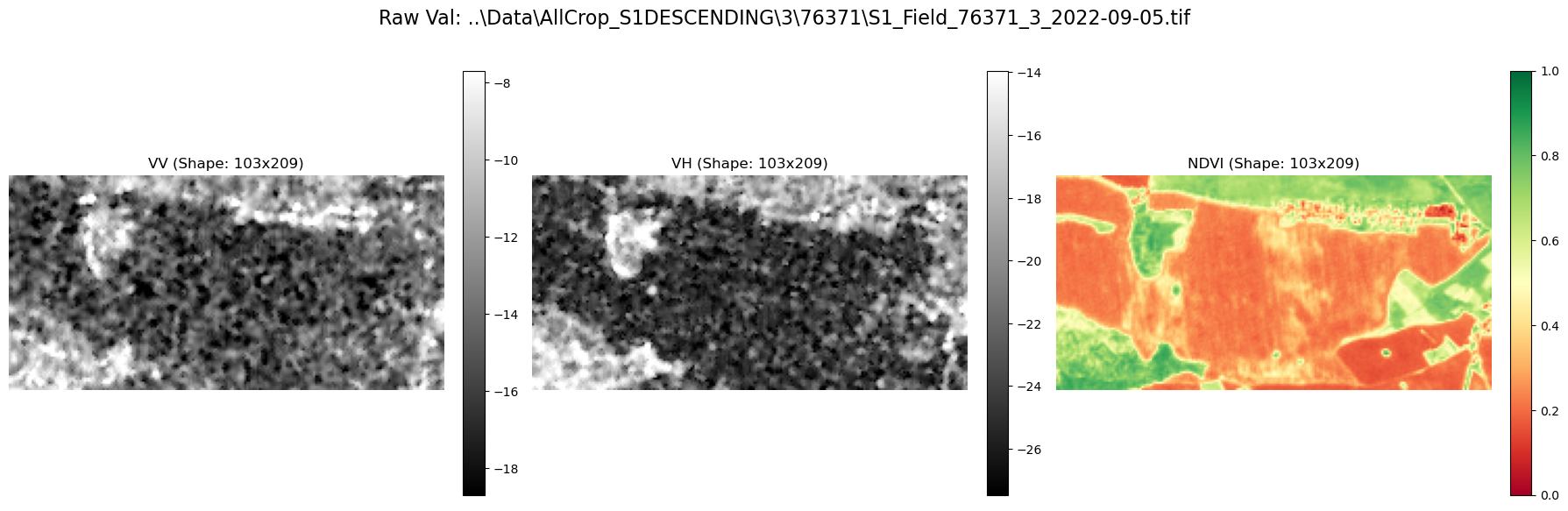 # RH.plot_from_bands(np.concatenate([rand_train_s1_image[0:2,:,:], rand_train_s2_image[p_i:p_i+1, :, :]], axis=0), PREDICTOR_NAMES + [PREDICTING_NAME], 'Raw Train: '+rand_data_train.FILEPATH_S1)