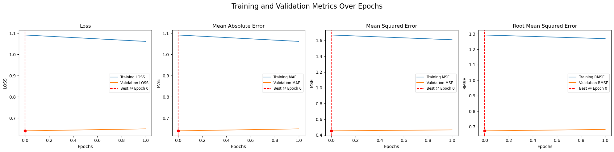 3/3 ━━━━━━━━━━━━━━━━━━━━ 59s 15s/step - loss: 1.0915 - mae: 1.0915 - mse: 1.6701 - rmse: 1.2923 - val_loss: 0.6390 - val_mae: 0.6390 - val_mse: 0.4539 - val_rmse: 0.6737